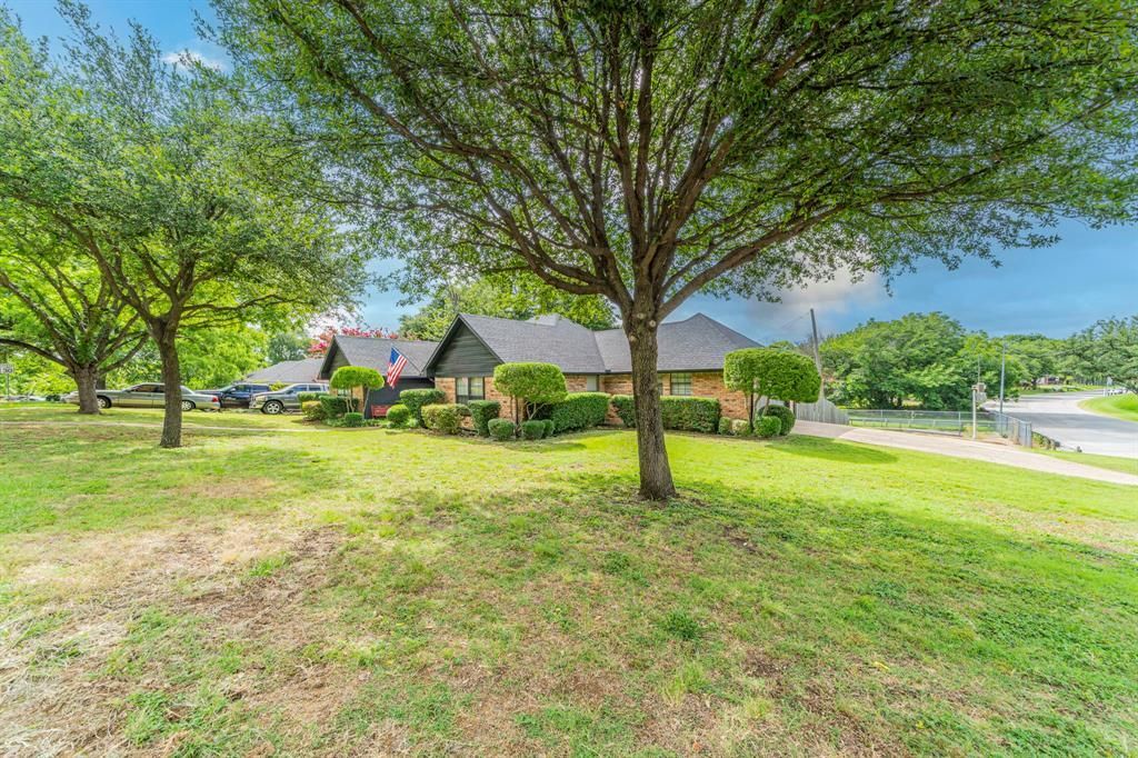 Honey, stop the car! Nestled in the serene community of Holiday Hills Estates, this charming one owner, 3-bedroom, 2 bath brick home sits on over a quarter of an acre corner lot. Great curb appeal with a beautifully landscaped front yard and fresh exterior paint. Inside, you will find a well-designed layout with vinyl plank flooring and neutral colors throughout. Spacious primary bedroom features a large walk-in closet, updated vinyl flooring, neutral colors and an accessible primary bath. Secondary bedrooms are the only carpeted rooms. Spacious living area features solid wood built-ins, and a floor to ceiling brick fireplace. Dining room displays a custom chandelier and a wall of windows overlooking the private backyard and is open to the kitchen. The kitchen has lots of natural light, updated stainless appliances, a double sink and ample counter and cabinet space. Conveniently located in the center of the metroplex and minutes from PGBT, I30 and DFW airport. Show and sell this well-maintained one-story custom home.