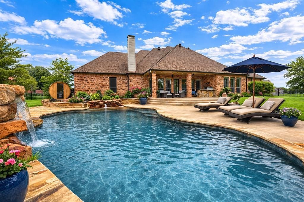 Absolutely stunning custom-built home on a premium cul-de-sac creek lot, designed for luxury living and exceptional entertaining. This impressive layout offers 5 bedrooms and 4 bathrooms, with the media room, 5th bedroom, and 4th bath privately located upstairs, creating the perfect guest retreat.The main level features 4 spacious bedrooms with 8-ft doors, tiered ceilings, extended crown molding, and oversized walk-in closets, thoughtfully separated for privacy. A grand entry with soaring ceilings and wood floors welcomes you, alongside an elegant office or formal dining space.The open-concept island kitchen is the heart of the home, featuring stainless steel appliances, pot filler, multiple pantries, large island, and stone façade bar area, all overlooking the Texas-sized living room with corner fireplace, built-in TV cabinetry, surround sound, and wood floors. A rare downstairs game room with dual entry access adds even more space for entertaining.Step outside to your private backyard oasis featuring a lagoon-style pool with waterfall and firepit, surrounded by wrought iron fencing and ample yard space. The covered outdoor living area includes an outdoor kitchen with built-in BBQ, beverage fridge, granite countertops, TV, and outdoor speakers, plus an additional sun patio with loungers and umbrella stands.Additional highlights include oversized garage with wood doors, updated zoned HVAC , sprinkler system, custom millwork, hidden safe, abundant storage, extra parking, plantation shutters, and an oversized utility room with space for two sets of washers and dryers.A truly exceptional home designed for comfort, entertaining, and luxury living. Must see.