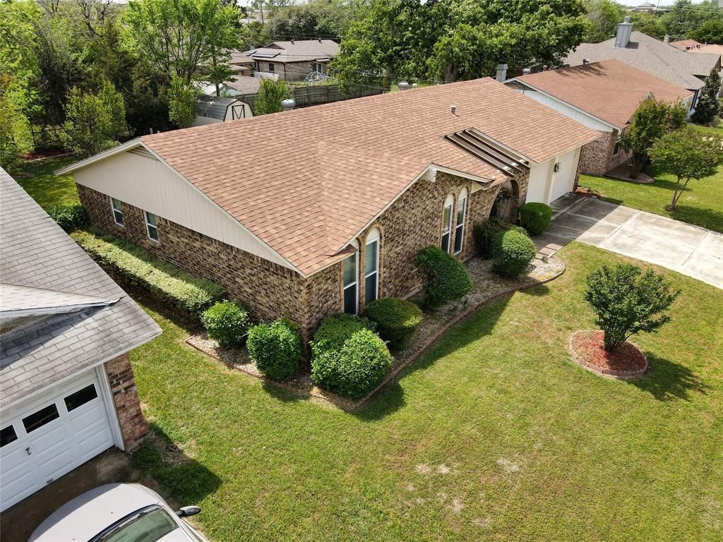 1037 Barber St, Hurst, TX — clean, classic, and immaculately maintained. This single-story ranch-style brick home has pleasing & striking curb appeal: warm brick, light trim, and an arched recessed entry w storm-screen door & arched windows that complement a distinctive look. Inside, it’s an open plan w living + dining + kitchen flowing together, and the living room sits at the center of it all—easy sightlines, good flow, and a comfortable setup for everyday life. Look up and you’ll notice the vaulted ceiling w the center beam—nice touch and it makes the space feel bigger. The window package is a big plus here: vinyl double-pane (low-E) double-hung windows throughout, lots of daylight, and they come w transferable lifetime warranty. Window coverings stay. The galley kitchen is set up for real use —plenty of cabinets, solid counter space, and a separate pantry. Appliances convey: refrig, microwave, dishwasher, oven, cooktop & vent. Laundry is separate with cabinets and washer-dryer convey. The primary suite is generously sized (approx 16x11) w a huge walk-in closet + ensuite bath. Floors are a practical mix of laminate, tile, & carpet. Out back, there’s a 16x16 covered patio-pergola plus a privacy fence-gate. The lot feels roomy, w mature shade trees, landscaping, fencing, and a 15x9 storage shed. Mechanical + big items: Trane R410-A.16 SEER HVAC, Rheem gas HWH w recirc pump, and an impact-resistant Class 4 roof (CertainTeed Landmark IR). Attic has blown-in insulation + spray-on heat block. Partial cast-iron plumbing replacement (between house and sewer) has been completed, and there’s a termite treatment-maintenance plan in place. The 2-car garage has an extended area w work bench + extra storage—great for projects and gear. Convenient to everyday stops and commuter routes, and part of HEB ISD. Priced for affordability and a great catch for anyone looking in the HEB ISD area and walking distance to the northeast mall.