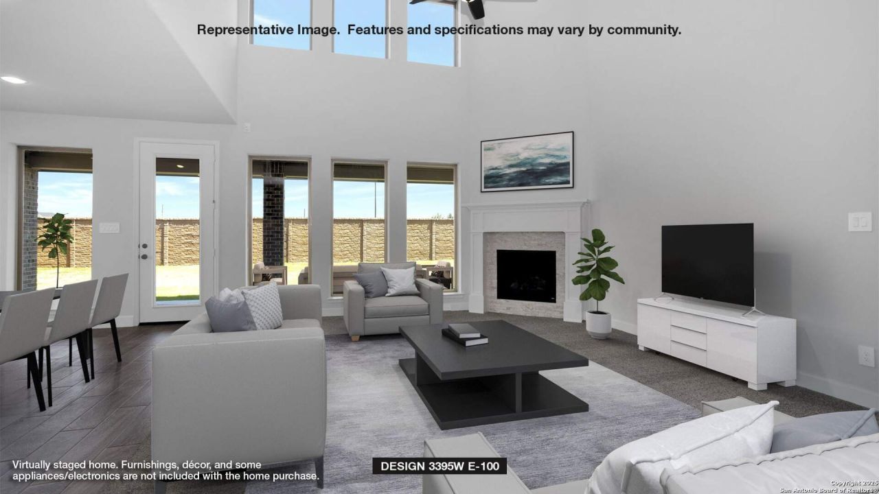 Home office with French doors set at entry with 20-foot ceiling. Formal dining room opens to rotunda with curved staircase. Two-story family room with 18-foot ceiling, wood mantel fireplace and wall of windows opens to kitchen and morning area. Kitchen hosts generous island with built-in seating space and 5-burner gas cooktop. Primary suite with a wall of windows. Primary bath includes dual vanity, freestanding tub, separate glass-enclosed shower and large walk-in closet with access to utility room. First-floor guest suite. A game room, media room and two secondary bedrooms are upstairs. Extended covered backyard patio. Mud room off three-car garage.