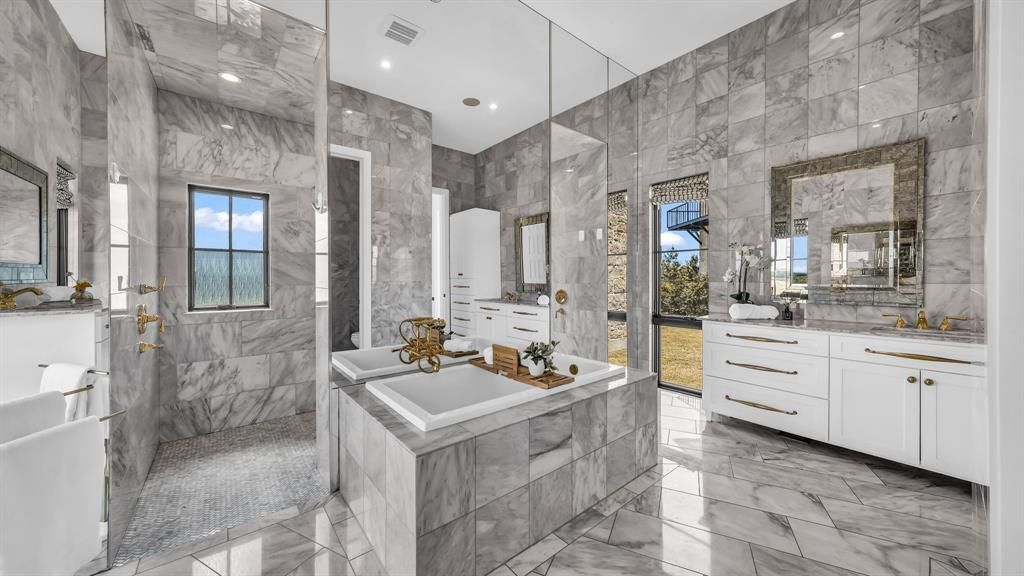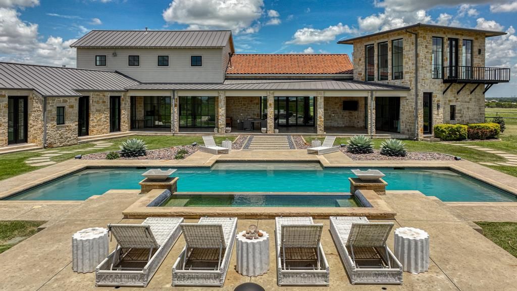 Reduced to Sell! Set in the heart of Rocky Creek Ranch Estates, this exceptional 50+ acre property offers a refined and private country living experience just minutes from FTW. The 6,987 sq ft home is filled with natural light, featuring floor-to-ceiling windows and a grand great room with soaring ceilings, fireplace, and wet bar. The chef’s kitchen includes a marble island, built-in double refrigerators, Wolf range, dual sinks, and dual dishwashers, with a formal dining room and butler’s pantry with coffee bar nearby. Additional spaces include a work room and utility room that doubles as a safe room. The private owner’s wing offers a fireplace, spa-style marble bath, oversized closet, and lounge area with a walk-in wine room. A second-floor office with balcony overlooks the property. Three additional bedrooms, bathrooms, and a separate living area are located on the opposite side of the home. Outdoor features include a pool, hot tub, sun ledge, and spacious patio for entertaining. Equestrian improvements include a finished 7-stall barn with a tack room, a round pen, and an apartment for guests or staff. Cross-fenced pastures with pipe top-rail and no-climb fencing support horses or cattle. Additional features include a shop, private water well, and water storage. Conveniently located minutes from Chisholm Trail Parkway, Tarleton State University’s Fort Worth campus, and approximately 20 minutes from downtown Fort Worth.