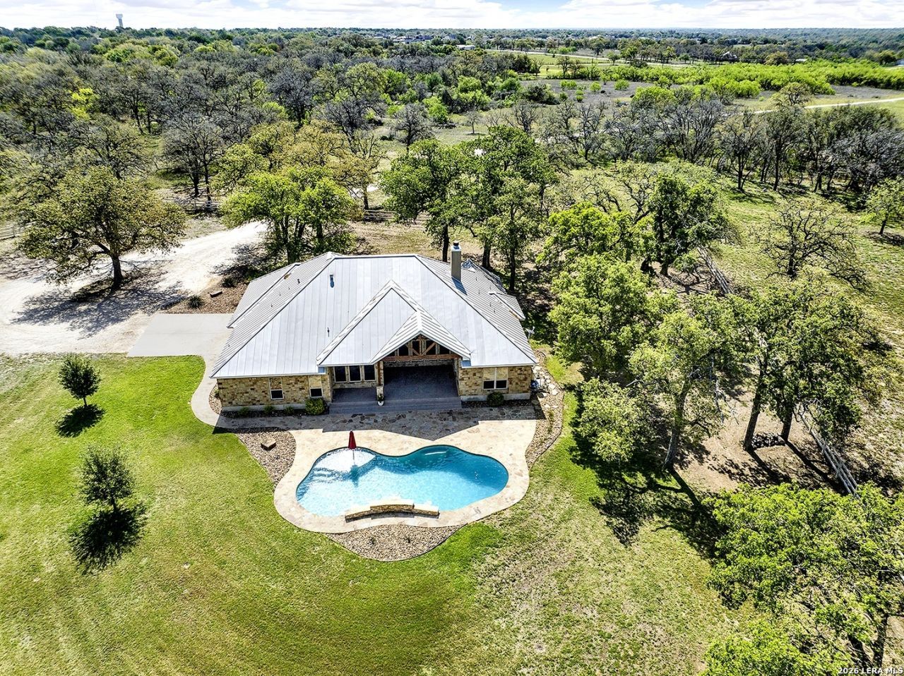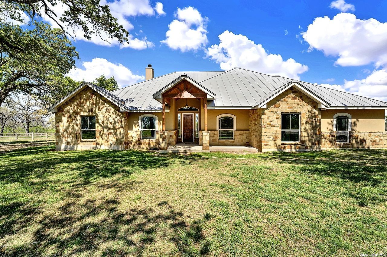 Great opportunity to own your own piece of Texas country with this gorgeous ranchette just outside the San Antonio Area. The picturesque property features 25 acres studded in mature trees with a gorgeous Ranch style rock and stucco home with a metal roof and modern finish out. Beautiful Open Floor Plan featuring 5 bedrooms, 3 full bathrooms, additional Office and separate Game Room (5th BR) with wet bar area and on-suite bathroom. Tile and Engineered Hardwood floors throughout and a Grand Rock Fireplace from ceiling to floor. Open living plan, with a chefs kitchen with premium appliances and a large granite bar for ample seating. House is fully Spray Foam Insulated, including the garage. Large windows in the main living area over look the large covered patio that leads you to the inground pool surrounded by flagstone and a water fall feature. Sprinkler system yard and mature trees to keep a canopy of shade in the vinyl fenced in yard. Ample parking space and gravel area for parking and circle drive, 2 car garage (will fit 2 dually trucks), Stock Tank located in the back of property and maintains an Ag Exemption due to the lush coastal grass up front for hay production. Wooded back acres are a wildlife paradise. This property has so much to offer and beautiful secluded setting all while being conveniently located to the La Vernia community as well as 25 MI commute to downtown SA. Located less than 5 miles outside Loop 1604.