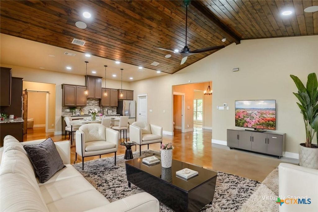 Set wide and open on 9 scenic acres, this property offers space to breathe, room to grow, and the comfort of a truly beautiful home. Fenced and cross-fenced, its ideal for those who crave both function and freedom, whether for livestock, gardening, or simply spreading out under the Texas sky. A 40x30 carport and a 20x20 barn stand ready for your tools, toys, or weekend projects. From the moment you arrive, the colorful landscaping that frames the welcoming front porch sets the tone?this is a home with heart. Inside, the charm continues with stained concrete floors that run throughout, combining rustic warmth with everyday practicality. The great room is nothing short of stunning, featuring a raised wood ceiling with recessed lighting, a fireplace, and wide-open space that flows seamlessly into the island kitchen. With granite counters and a mosaic tile backsplash, the kitchen is both striking and functional?a place made for everything from weeknight meals to holiday feasts. Just off the kitchen, the dining room offers plenty of space for gathering. The owner's suite is a true retreat, with a tray ceiling trimmed in crown molding and a spa-inspired bath complete with a corner soaking tub, separate shower, and granite-topped double vanity. The homes thoughtful layout includes a spacious utility room with cabinets and countertop space, and a huge second living room perfect for movie nights, game days, or simply spreading out. Step outside to the covered back patio, where a wood ceiling and ceiling fan invite you to sit and stay a while. Whether youre watching the sunrise over the pasture or winding down under a sky full of stars, this space turns every moment into something special. This property is more than just a house on land?its a place to plant roots, create memories, and enjoy the kind of peace that only wide-open space can offer.