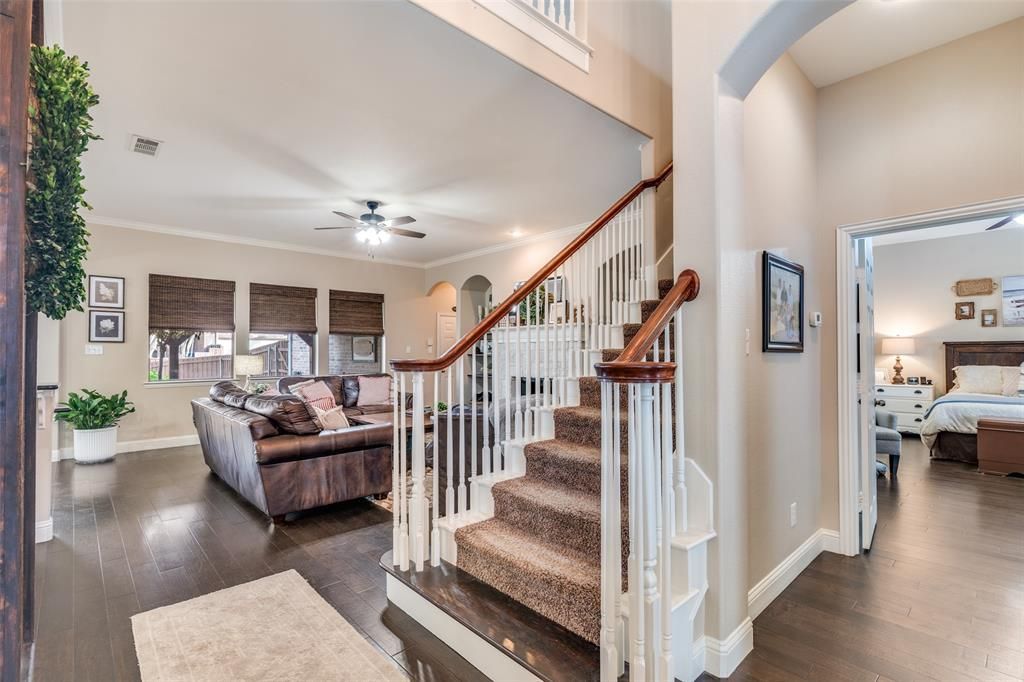 **New pictures** This well maintained five bedroom and 3 and a half-bathroom home has space for all of your needs. Downstairs is a large living room with built in shelves, 2 dining areas with updated lighting, kitchen with white cabinets, an updated half bath, plus an oversized primary bedroom with ensuite bathroom. Upstairs has 4 bedrooms, 2 full bathrooms, a large game room, and a flex space loft. The loft space has many options: office, play area, reading area, pool table room, etc . Outside you will find an extended covered patio with lighting great for relaxing. From the front yard swing, you can steal a peek of the lake on this quiet interior lot and road. Walking distance to the neighborhood park.
