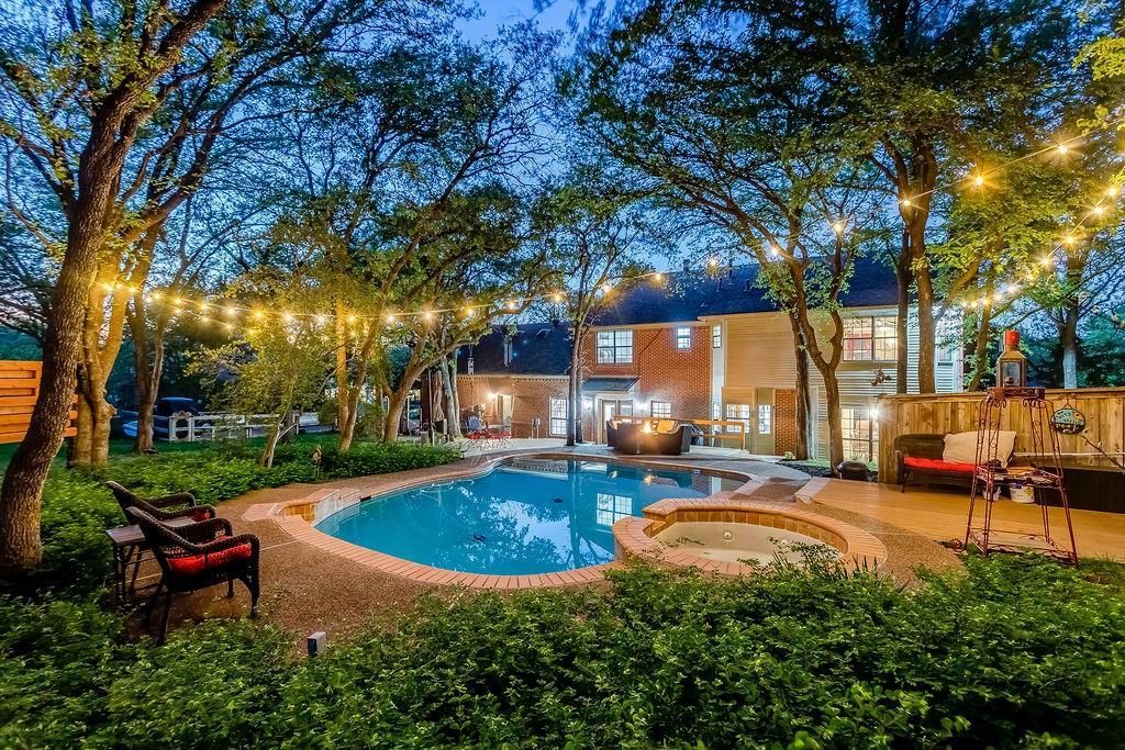 Tucked beneath a canopy of mature trees, this home feels like a quiet escape from the world, yet everything you need is just minutes away. Set on nearly an acre, the property invites you to slow down and breathe. Mornings begin with coffee overlooking the garden, afternoons unfold by the sparkling pool, and evenings are meant for gathering, whether in the open kitchen and living space, around one of the cozy fireplaces, or outdoor dining. The heart of the home is the kitchen, which flows to the living area and framed by views of the backyard, which creates a natural flow for both everyday living and effortless entertaining. Designed with comfort and functionality in mind, you’ll find a dedicated home office, a wet bar for hosting, and abundant storage throughout. The oversized primary suite offers a peaceful retreat, complete with a sitting area, luxury bath, and custom closet. A separate guest suite with its own kitchenette provides privacy and flexibility for visitors or extended stays. About 22 minutes to DFW Airport, this home is also close to shopping, dining, and entertainment in nearby Flower Mound, Highland Village, Denton, Roanoke, and Southlake. This is more than a home. It’s a place to unwind, gather, and truly live!