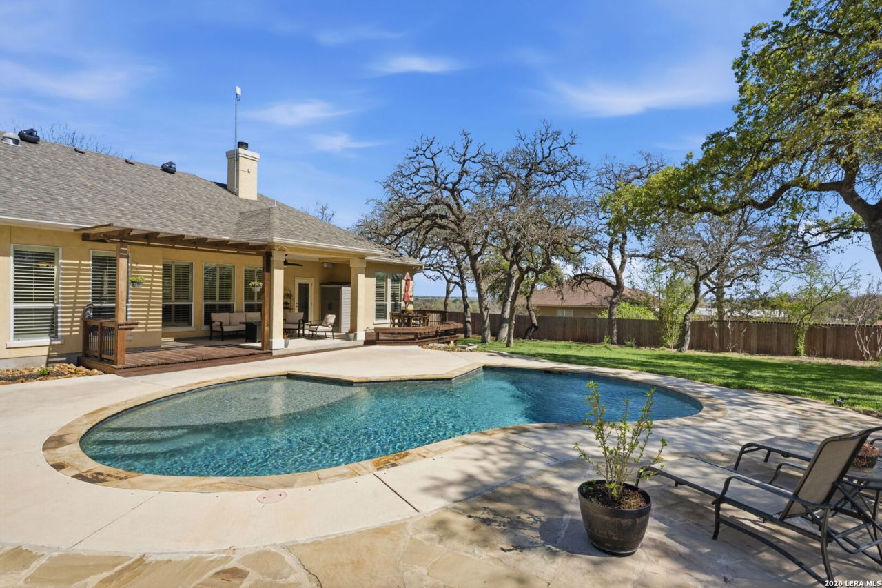 Welcome to 144 Hidden Forest where luxury, comfort, and charm come together in one perfect package. Nestled on a beautifully treed one acre lot in the highly sought after Hidden Forest community of La Vernia, TX this exquisite single story home offers 4 bedrooms, 2.5 baths, a 3 car garage, and a 2 car carport, along with a climate controlled outbuilding complete with an RV hookup, the ideal flex space for a home office, workshop, or fitness studio! Step inside to discover a fantastic open floor plan filled with natural light, featuring high ceilings, crown molding, plantation shutters, and a stunning stone fireplace as the centerpiece of the living area. The homes thoughtful design includes hard surface flooring throughout, no carpet anywhere! The chefs kitchen is the heart of the home, with an abundance of cabinetry, granite countertops, walk in pantry, induction cooktop, beverage refrigerator, and spacious breakfast bar that is perfect for gatherings. An easy home to entertain in with a formal dining room area and breakfast area! The split bedroom layout offers privacy and flexibility. The primary retreat overlooks the sparkling pool and boasts a spa like ensuite with dual vanities, a garden tub, separate shower, and an expansive walk around dressing closet youll have to see to believe! Two secondary bedrooms share a convenient Jack and Jill bath, and a fourth bedroom with a large walk in closet easily doubles as an office or guest space. Outside is pure paradise, a private backyard oasis with a sparkling inground pool, custom decking and landscaping, mature oak trees, covered porch, and a half bath positioned perfectly for poolside use. The home also features newer upgrades, including a roof and fencing (2023) and AC system (2021), ensuring efficiency and peace of mind. This property delivers the best of country living with modern sophistication! Dont miss your chance to make 144 Hidden Forest your forever home. A rare opportunity to own a home in the quiet subdivision of Hidden Forest! NO HOA and highly desirable La Vernia ISD!