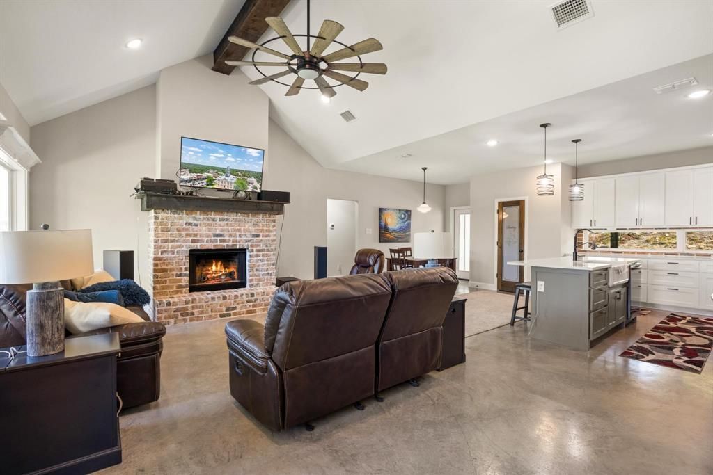 An open, bright and welcoming split-floorplan greets you entering this 2022 built, upscale home, perched on a cleared and landscaped hill in Mountain Lakes Ranch. Expansive regional views from the Living Room, Office, Primary Bedroom and front porch. Abundant cabinetry with a classic farm sink inset in the large island Kitchen with an adjacent walk-in Pantry. A handsome woodburning brick fireplace with hearth and mantle highlights the Living Room. Vaulted and tray ceilings showcase the open feel in the Living Room and Primary Suite. A large 11 x 11 Office is just off the entryway. The oversized laundry room, with sink, has dual access into the main home and into the backside of the Primary walk-in closet. Oversized garage is 27 feet deep. Mountain Lakes is an upscale subdivision with two lakes for fishing and boating. The community has RV parking-storage, private RV camping, a community pool, clubhouse, park and playground. It is located midway between Granbury and Stephenville. Granbury is known for its tourism and boating. Stephenville is home to the exploding Tartleton St. Univ and the Cowboy capitol of Texas. Bluff Dale hosts multiple well known eateries, an historic pub and live music.