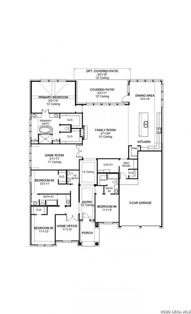 Welcoming entry framed by home office with French doors. Spacious game room with French door entry. Spacious family room features a wall of windows and a wood mantel fireplace. Island kitchen with built-in seating space, two wall ovens, a 5-burner gas cooktop and a walk-in pantry flows into the dining area. Primary bedroom with a wall of windows. Primary bath features French doors, dual vanities, two walk-in closets, two linen closets, freestanding tub and a separate glass enclosed shower. Secondary bedrooms joined by a Hollywood bathroom. Private guest suite with a full bathroom and walk-in closet near front of home. Extended covered backyard patio. Utility room and mud room just off the three-car garage.