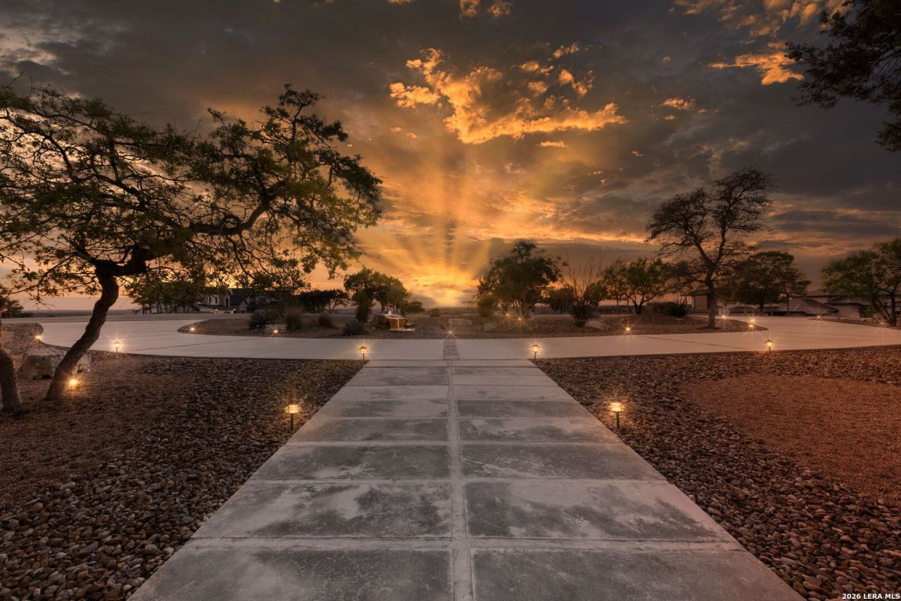 Experience Hill Country living at its finest from this stunning hilltop home, offering breathtaking panoramic views and exceptional amenities just minutes from town. Situated on over three wooded acres in a quiet cul-de-sac, this newer custom home blends privacy, comfort, and thoughtful design. Inside, the single-level layout features vaulted ceilings, expansive picture windows, and an open-concept great room that perfectly frames the surrounding landscape. The gourmet kitchen is a true centerpiece, highlighted by a handmade custom vent hood, quality finishes, and ample space for gathering. Tile flooring runs throughout, complemented by an impressive stone fireplace that adds warmth and character. The spacious primary suite is a private retreat, complete with a coffered ceiling, spa-like ensuite featuring a marble soaking tub, walk-in shower, dual vanities, and generous closet space. A split floor plan places two guest bedrooms on the opposite side of the home, sharing a well-appointed bath with separate vanities, while an additional full bath offers convenient access to the pool area. Designed for entertaining, the outdoor living space is unmatched. Enjoy an extended covered deck with a built-in barbecue, sink, and dual mini fridges-all perfectly positioned to capture afternoon shade and overlook the custom pool and spa with a dramatic waterfall feature. The property also includes a large gated lawn, private trails, a charming log cabin with a wood-burning stove and sleeping space, a bridge, and a firepit-creating a true Hill Country escape. Additional highlights include an extended three-car garage and carport, whole-house generator, instant hot water circulation system, and wired outdoor speakers. As an added perk, select furnishings, smart TVs, and even a UTV may convey with the sale, making this an incredible turnkey opportunity.