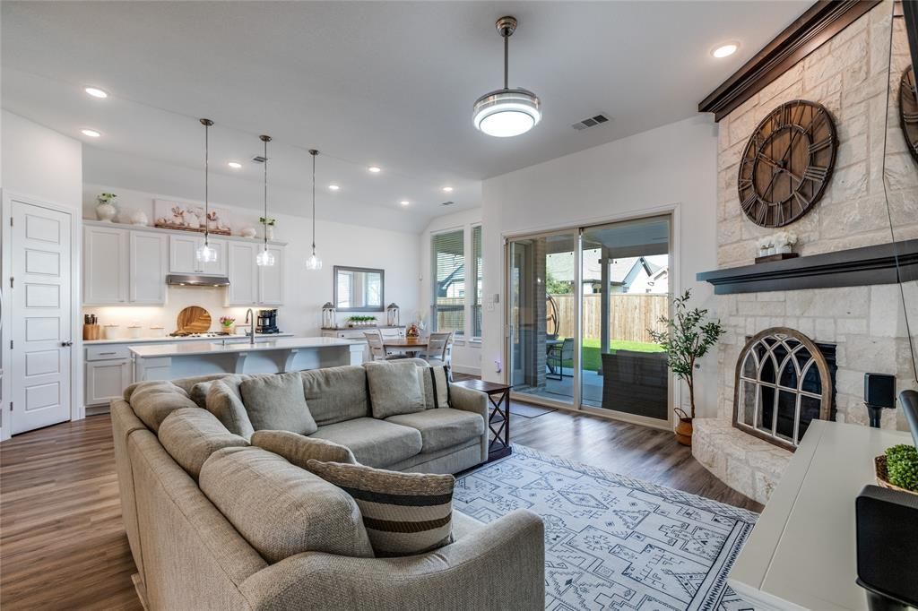 This beautifully maintained one-story residence sits on a desirable corner lot in Celina within highly rated Prosper ISD. Featuring 4 spacious bedrooms and 3 full bathrooms, the home offers an open, light-filled layout ideal for both everyday living and entertaining.The chef’s kitchen showcases upgraded quartz countertops, painted white cabinetry with hardware, built-in double ovens and microwave, and an eat-in dining area that flows seamlessly into the family room with a stunning stone fireplace. Upgraded flooring spans the main living areas, complemented by plush upgraded carpet in all bedrooms.The private primary suite features bay windows, an oversized walk-in shower, and a separate garden tub. Additional highlights include 11-foot ceilings, 8-foot interior doors, and extended outdoor living with a covered patio accessed through a large sliding glass door.The backyard is thoughtfully designed with low-maintenance artificial turf, offering year-round greenery and functionality. Meticulously cared for and filled with natural light, this home presents a wonderful opportunity to enjoy modern living in a sought-after community.