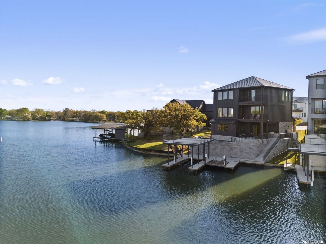 New construction by Keith Wing Custom Builders with waterfront improvements and open water views on Lake LBJ. This property delivers the lake lifestyle from day one with a boathouse featuring lift, entertainment deck, double jet ski ramps, and dock access ready for boating and recreation. Outdoor living is front and center with an infinity pool and hot tub overlooking the water, covered and uncovered patios with cedar plank ceilings, built-in speakers, and a full outdoor kitchen with gas grill and granite counters. Multiple balconies capture wide lake views and create ideal spaces for relaxing or hosting. Inside, the home showcases quality construction with large windows overlooking the lake, solid wood doors, oversized baseboards, recessed lighting, and an elevator connecting levels. The kitchen features Michael Edwards custom cabinetry, quartz countertops, designer backsplash, JennAir appliances, 6-burner gas range with double ovens, pot filler, and farm sink, plus beverage fridge and open shelving. The owners suite includes sweeping lake views, soaking tub, walk-in shower, double vanity, and walk-in closets, while a secondary bedroom offers balcony access, en suite bath, and water views. New construction. Dock setup in place. Open water views. Lake LBJ ready.