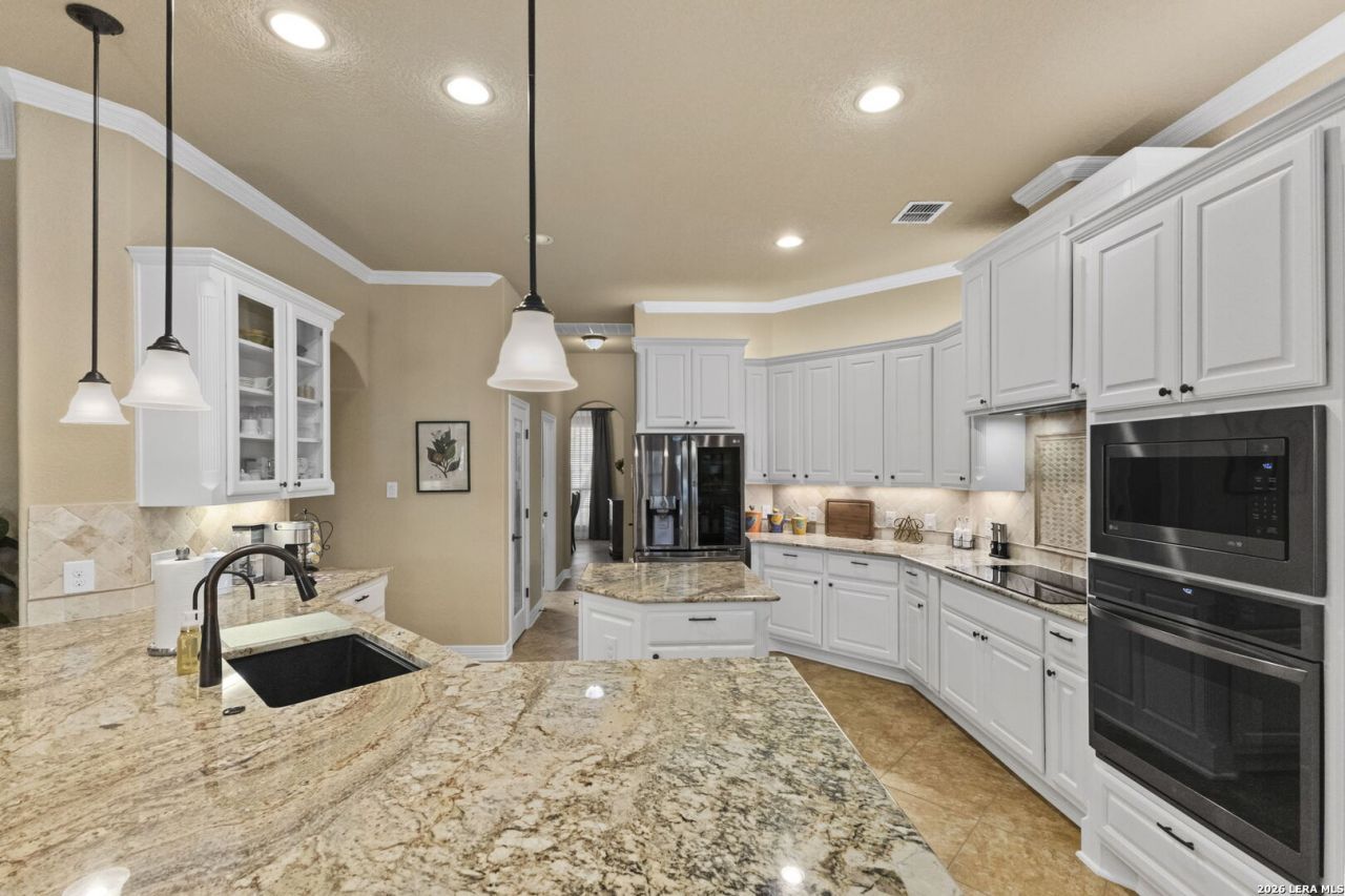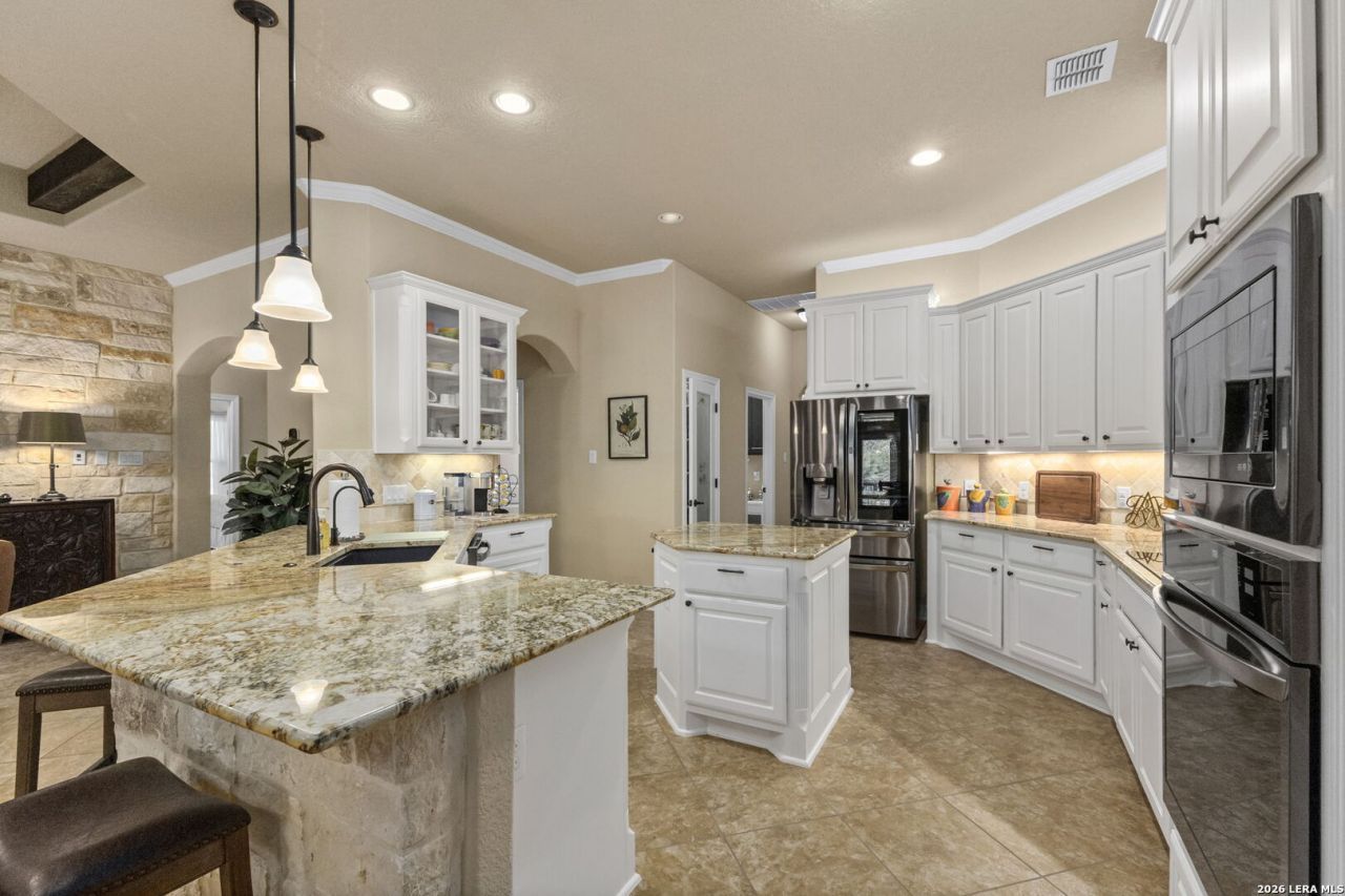 Set among mature trees in the prestigious Fair Oaks Ranch community, this 4-bedroom, 3.5-bathroom home blends timeless elegance with thoughtful design. Beautiful curb appeal and refined accents welcome you into an open, inviting interior filled with warmth and character. The living room makes a striking impression with rich wood beams, a stone accent wall, and custom built-in shelving-creating a space that is both sophisticated and comfortable. The spacious chefs kitchen is designed for both everyday living and entertaining, featuring stainless steel appliances, an inlay oven and microwave, an electric cooktop, abundant cabinetry, and a peninsula with bar seating. The seamless layout flows effortlessly into the formal dining room and a dedicated front office, offering the perfect balance of gathering spaces and quiet work areas. The grand primary suite serves as a private retreat, complete with a spa-like en suite bathroom featuring dual vanities, a soaking tub, separate shower, and an expansive walk-in closet. An additional dedicated media room provides the ideal setting for movie nights, game days, or relaxing with family and friends. Step outside to a generous covered patio overlooking a spacious backyard-perfect for al fresco dining, entertaining, or unwinding in the shade of mature trees. Located in the highly sought-after Fair Oaks Ranch community, this home offers a serene Hill Country lifestyle with convenient access to shopping, dining, and top-rated schools-delivering the perfect blend of luxury, comfort, and everyday convenience.