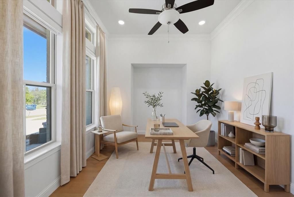 Set on a premium greenbelt lot near the trailhead in Point Vista, this home offers a level of privacy and outdoor living that is rarely available. The backyard feels like a private retreat, with a resort-style pool and spa, jellyfish lighting, fire features, expansive decking, low maintenance artificial turf, and a covered patio complete with outdoor kitchen, Sonos surround sound, motorized screens, and overhead heaters designed for year-round use, plus a dedicated wellness area featuring an infrared sauna and cold plunge. Inside, the home balances clean design with elevated finishes. Hardwood floors run throughout the main living areas, and the open kitchen is striking with custom cabinetry to the ceiling, GE Profile appliances, a built-in Bosch refrigerator, oversized island, expansive walk-in pantry, pocket office, and a built-in pellet ice maker. The primary suite is positioned to take in the backyard views and offers a spa-like bath with soaking tub, separate shower, dual vanities, and a custom walk-in closet with built-ins. Additional spaces include a downstairs guest suite, a dedicated office, and an upstairs second living area perfect for games, toys, or TV. The garage has been thoughtfully transformed into a climate-controlled space with epoxy flooring, custom steel doors with windows, and a separate bonus room perfect for exercising or extra storage. A whole-home Generac generator, reverse osmosis system, and extra insulation in attic add an additional level of efficiency and convenience. Direct access to neighborhood trails and greenbelt creates a setting that is difficult to replicate, while still being minutes from Aledo schools and local amenities.