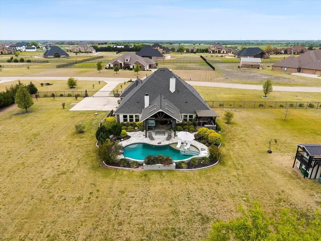 Experience the epitome of luxury living in this magnificent one-story custom country manor, nestled on nearly 1.5 acres in a prestigious gated community. This stunning property offers ultimate privacy with lush landscaping and a tree-lined backyard. The open floor plan features a cozy family room with a striking stone fireplace, seamlessly flowing into a chef’s dream kitchen. The kitchen is equipped with custom cabinetry, elegant granite countertops, a breakfast bar, a spacious pantry, and upscale stainless steel appliances. The adjacent breakfast area offers a perfect spot to enjoy your morning coffee. Entertain in style in the gorgeous dining area, and work from home in the beautifully appointed office. The master suite is a private retreat with a sitting area and a spa-style bath, featuring his and her vanities and a walk-in closet. Guests will feel right at home with a lovely guest bedroom and two additional auxiliary bedrooms. The game room and media room will be a favorite spot for family fun. Step outside to your own paradise: enjoy the outdoor living area with a fireplace, a summer kitchen for barbecues, a resort-style pool, a greenhouse, and a playground. There's plenty of room to roam in the private backyard, and a huge three-car garage with additional parking ensures convenience.This property is truly a must-see—fall in love at first sight!