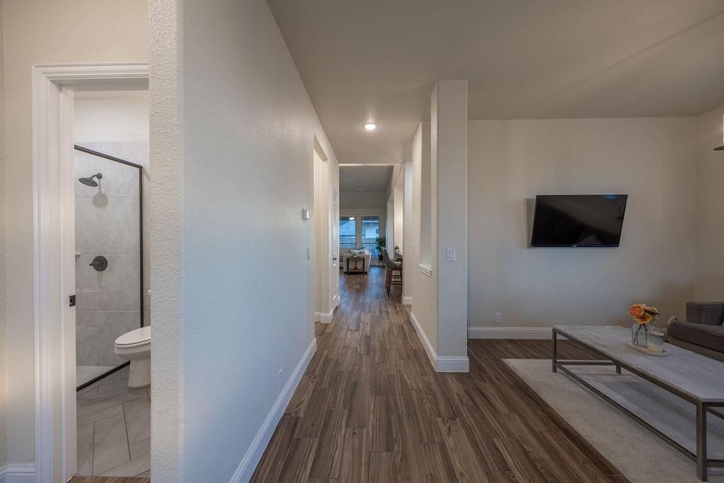 Situated on a premier 70-ft corner lot, this striking 2023 home immediately stands out with its scale, presence, and highly sought-after layout featuring two bedrooms on the first floor. Offering 3,496 square feet of well-designed living space, the home includes 5 bedrooms, 4 full bathrooms, two spacious living areas, a game room, media room, and an expansive covered patio—perfect for both entertaining and everyday living. From the moment you step inside, you’re greeted by soaring ceilings, abundant natural light, and a clean, modern aesthetic that creates a warm yet sophisticated atmosphere. The front living area offers incredible flexibility, ideal for a formal dining space, home office, or additional lounge. The open-concept main living area is anchored by a striking stacked-stone fireplace, seamlessly connecting to the heart of the home—the thoughtfully designed kitchen, complete with quartz countertops, a stylish backsplash, stainless steel appliances including a gas range, and a large center island perfect for gathering, hosting, and daily use. The spacious primary suite provides a private retreat with dual vanities, a garden tub, and a modern walk-in shower. A standout feature of this home is the desirable first-floor layout with a secondary bedroom and full bath, ideal for guests, multigenerational living, or added convenience. Upstairs, you’ll find a large open game room, a dedicated media room, three additional bedrooms, and two full bathrooms, offering plenty of space for everyone. Step outside to enjoy the expansive backyard and covered patio with endless possibilities for outdoor living and relaxation. Endless opportunities with the over-sized backyard, Thoughtfully designed for comfort, functionality, and modern living, this home delivers space, style, and versatility in one impressive package.