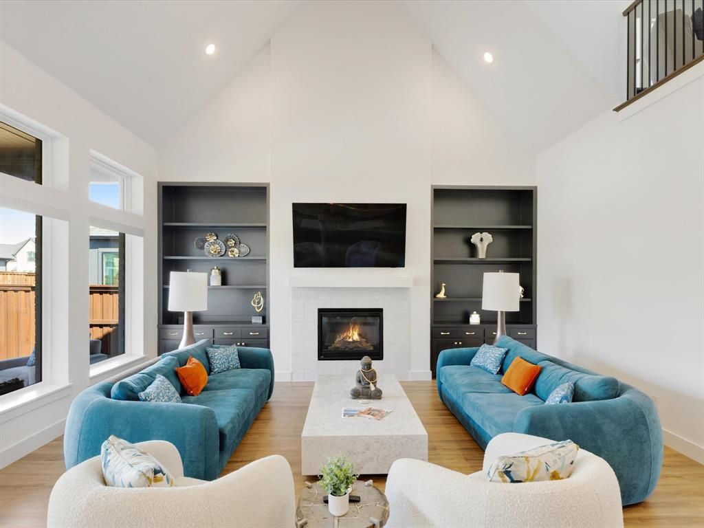 Experience luxury living in this stunning 5-bedroom, 5.5-bath home located in the highly sought-after Windsong Ranch community in Prosper. Thoughtfully designed for both comfort and functionality, this home features a spacious layout with the primary suite, a private mother-in-law suite, and a third bedroom all conveniently located on the first floor. The heart of the home showcases soaring ceilings in the family room, highlighted by a beautiful fireplace and built-in cabinets, creating a warm yet sophisticated atmosphere. A private office with elegant French doors offers the perfect work-from-home space, while the downstairs media room is ideal for movie nights and entertaining.The gourmet kitchen features quartz ctops, double ovens, a farmhouse sink, a trash pull-out, and an abundance of cabinetry extending to the ceiling, complete with stylish hardware. The luxurious primary suite is a true retreat, complete with a spa-like ensuite bath featuring a freestanding soaking tub, an oversized shower with a stunning decorative feature wall, and quartz countertops. The suite also offers two expansive walk-in closets, with one conveniently connected to the laundry room—perfect for effortless access when bringing in dry cleaning. Upstairs, you’ll find a spacious game room along with two additional bedrooms, and 2 full baths, providing comfort and privacy for family or guests.This home is loaded with upgrades including extensive engineered wood flooring, electric shades, and designer lighting. The contemporary exterior showcases painted gray brick, striking black accents, and a sleek black roof for impressive curb appeal. Step outside to an oversized backyard featuring a custom lighting system and a freshly stained fence—perfect for relaxing or entertaining.Located in the highly acclaimed Prosper ISD, Windsong Ranch offers resort-style amenities including multiple parks, playgrounds, pools, a fitness center, on-site restaurant, and the renowned crystal-clear lagoon.