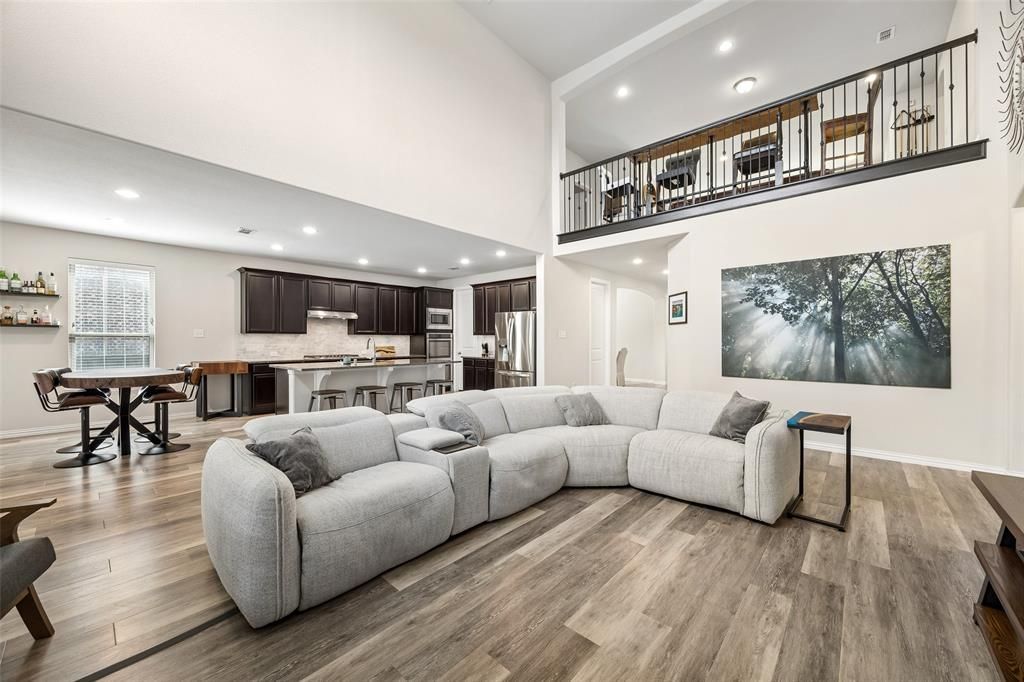 Impressive curb appeal welcomes you to this spacious 4-bedroom, 2.5-bath home in Sachse, offering approximately 3,703 square feet of thoughtfully designed living space to accommodate a variety of needs. Inside, the inviting living room showcases a soaring ceiling, large windows, and a striking fireplace that anchors the space while allowing natural light to fill the home. The modern kitchen is both functional and stylish, featuring an island with seating, built-in stainless steel appliances, a pantry, designer finishes, and a bright breakfast nook. The primary bedroom, located on the main level, provides a comfortable retreat with an ensuite bath that includes dual sinks, separate vanities, a separate shower, a large soaking tub, and a walk-in closet. Upstairs, spacious secondary bedrooms are complemented by a versatile layout that includes a family room, dedicated media room, and an additional bonus room ideal for a home gym, workspace, or hobby area. Ample storage throughout the home enhances everyday convenience. Outdoor living is equally impressive with an approximately 450-square-foot covered patio designed for year-round enjoyment. Highlights include a built-in grill, gas and wood-burning fireplace, stamped concrete, and a cedar cover, along with space for seating and entertainment. Situated on a quiet cul-de-sac with green space views, this energy-efficient home offers a peaceful setting along with access to community amenities. Combining generous living spaces, thoughtful design, and inviting indoor and outdoor features, this property presents a wonderful opportunity to enjoy comfort and versatility in a desirable location. 3D tour available online.