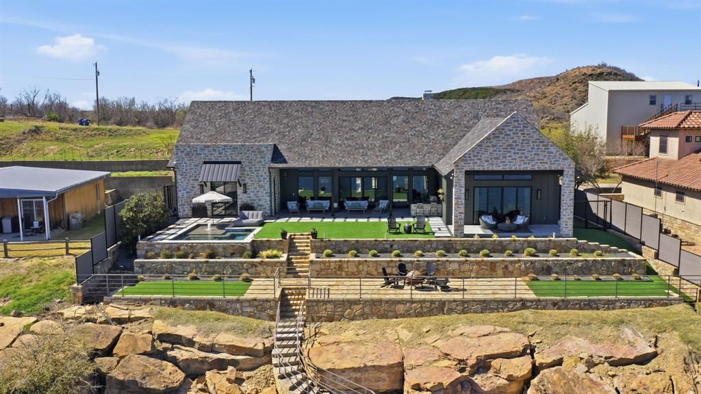 WATERFRONT LUXURY CUSTOM BUILT HOME on Possum Kingdom Lake! This gorgeous home has no detail left unmet! From the minute you pull in the private gate and wind down the drive you will feel at home and retreat into your own private space. Enter the home through thecustom iron door and immediately see the breathtaking views of PK Lake through the expansive doors and windows along the back of the house. Take in the beautiful open living, dining and kitchen area with vaulted wood ceilings and steel beams engineered just for this home! Theowners designed this home for privacy and entertainment. There are nice surprises throughout the kitchen such as a hidden coffee bar and bar cabinet, a HUGE gourmet island with a custom wood cutting board insert and a hidden caterers pantry; again, every need met throughmeticulous design. Upstairs you will find the bunk room and game room which can sleep up to eight people with its own ensuite bathroom. Downstairs each bedroom has its own walk in closet and lovely ensuite bathroom. Enjoy a secluded primary suite with amazing lake views andits own private patio. Also included is a fortified safe room for added protection and peace of mind. The oversized heated and cooled third car garage with beautiful epoxy floor finish is the perfect place to store your boat or RV, game tables, or work out equipment. Outside is whereyou will never want to leave! Enjoy your morning coffee watching the sun rise over the big open views of the lake. Then appreciate the cool shade in the evening after a day on the lake while cooking in your outdoor kitchen, relaxing in the heated and chilled cocktail pool or taking a walkdown to the dock with easy access to your boat and PWCs. The outdoor space is low maintenance with beautiful turf and a side yard for dog run. Also included is a 48KW Generac generator serving the entire home. Escape your busy life to Possum Kingdom Lake, and the quiet peacefulness of this home will make you never want to leave!