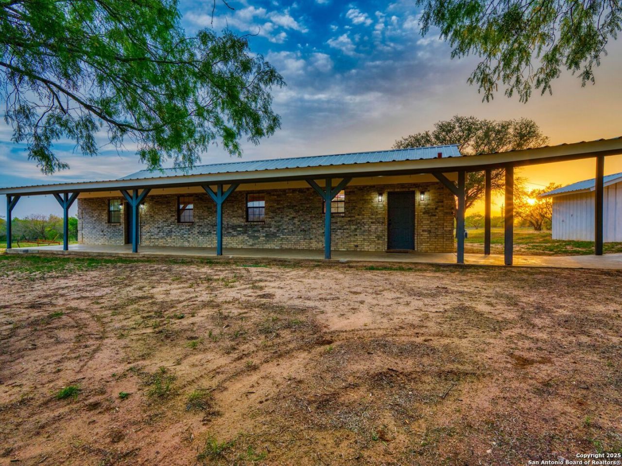 This picturesque 7-acre ranch boasts two dwellings with a combined 2,800 square feet of living space, featuring four bedrooms and three bathrooms. The main house has been recently updated with new countertops, cabinets, hardware, light fixtures, ceramic tile flooring, and fresh interior paint. High ceilings and open floor plans create a spacious ambiance, complemented by cathedral, vaulted, and tray ceiling designs that showcase true craftsmanship. Metal roofs on all structures with brick or masonry siding. Cement walkways lead to full-length front and rear patios. A detached entertaining area with a slab foundation and metal roof is equipped with electric outlets. Additional amenities include an RV storage barn, tractor/boat storage barns, and an oversized carport attached to the guest house. The ranch is serviced by city water and a private well. Located in the Dustin River Ranches community, access is secured by a power gate. The land is cleared with mature mesquite trees offering stunning views of South Texas landscapes. Conveniences are just two miles away, HEB Plus, dining options: Outlaw Kitchen, IHOP, Bill Millers, Tommy Joes, Whataburger, Burger King, Churches Chicken. Plus various retail outlets; South Texas Hardware, Dollar tree, Dollar General and many local shops.