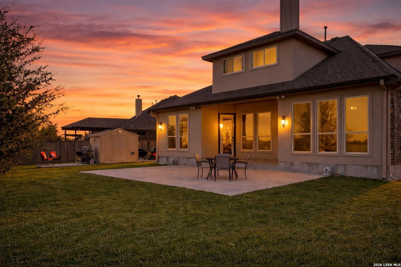 Welcome to this stunning 1.5-story home in San Antonio, a rare opportunity to own a spacious property on .83 acres with PAID-OFF solar panels, delivering energy efficiency and long-term savings from day one. With 5 bedrooms, 4 full bathrooms, and a large game room, this home offers the space and flexibility todays buyers are searching for. Step inside to an inviting entry with soaring ceilings and a formal dining room featuring elegant tray ceilings and abundant natural light. The open-concept living area is designed for both comfort and entertaining, showcasing beautiful wood flooring, a cozy corner fireplace, and seamless flow into the kitchen. Youll love the kitchens granite countertops, oversized breakfast bar, recessed lighting, and eat-in dining area with views of your expansive backyard. The primary suite is a true retreat with tray ceilings, dual vanities, a soaking garden tub, separate shower, and a huge walk-in closet. Step outside and experience what truly sets this home apart, nearly an acre of private land. Whether youre dreaming of a pool, workshop, outdoor kitchen, or just wide-open space to relax and entertain, this property gives you the freedom to create it. The oversized patio is perfect for gatherings, and the custom JellyFish lighting adds year-round ambiance and standout curb appeal. Super clean and loaded with upgrades, this home combines space, efficiency, and lifestyle in one incredible package, all conveniently located near Randolph AFB, shopping, and dining. Schedule your showing today and be sure to ask about the assumable VA loan opportunity.