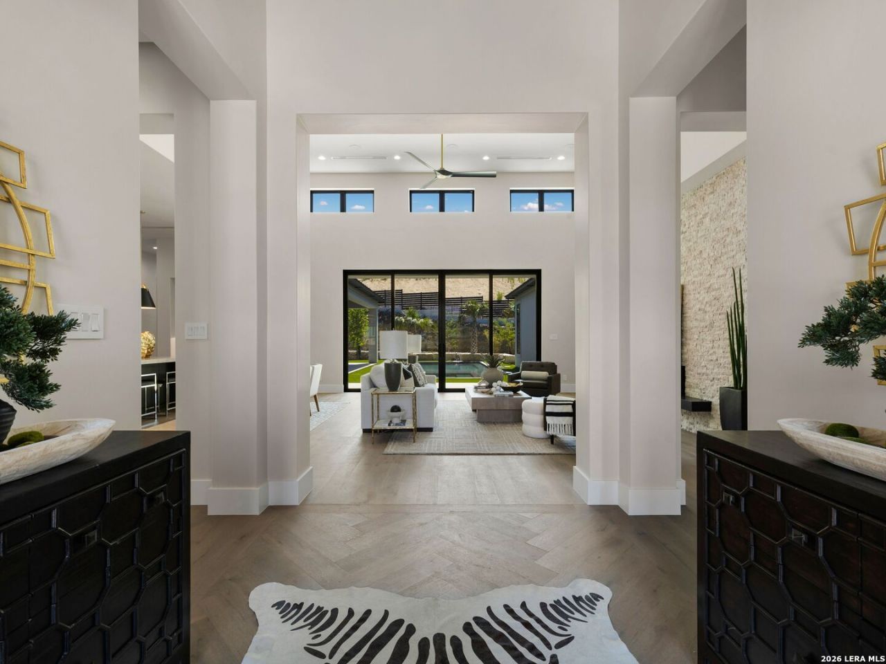 Brand new custom residence within The Dominion, thoughtfully designed with refined architectural detailing, strong spatial volume, and a highly functional layout. The home is centered around a dramatic great room with soaring ceiling heights, creating an open and inviting atmosphere ideal for both everyday living and entertaining. Clean modern lines and carefully executed architectural elements establish a cohesive and timeless aesthetic throughout. The chefs kitchen anchors the main living space and features natural stone countertops, a large center island, professional grade appliances, and seamless connectivity to the dining area, walk in pantry, and butlers pantry. Designed with both form and function in mind, the kitchen opens directly to the great room and outdoor living areas, fostering an effortless indoor outdoor lifestyle. The primary suite is privately situated on the main level and offers a vaulted ceiling, spa inspired bath with separate shower and soaking tub, and an expansive walk in closet designed as a true dressing space. A secondary guest bedroom with full bath is also located on the main level, providing flexibility for guests or multigenerational living. A dedicated study and a spacious game room with wet bar further enhance the homes versatility. Outdoor living is seamlessly combined and highlighted by a covered patio, outdoor kitchen, and a resort style pool and spa surrounded by thoughtfully designed low maintenance turf landscaping, offering year round enjoyment with minimal upkeep. Two additional bedrooms are located on the second level, creating a balanced separation between private and guest spaces. A three car garage completes this exceptional Dominion offering.