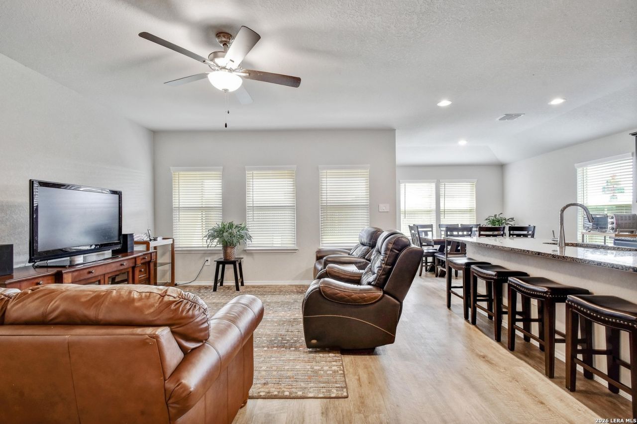 MOTIVATED SELLER! NON SMOKING HOME! This beautifully maintained home is in pristine condition and features a modern, neutral color palette with an open-concept floor plan thats perfect for entertaining or relaxing. With three spacious bedrooms and two full bathrooms, this layout offers both comfort and privacy. The kitchen is a chefs dream with a large center island, abundant counter space, gorgeous granite countertops, a stylish backsplash, stainless steel appliances, and a walk-in pantry. The guest bedrooms are thoughtfully separated from the primary suite, ensuring privacy for visitors. The primary bedroom includes a luxurious en-suite bath with a double vanity and a large walk-in closet. Additional highlights include a walk-in storage closet in the hallway-ideal for storing holiday decorations, seasonal items, or even converting into a small playroom or hobby space. Enjoy outdoor living in the spacious backyard with a covered patio and a wooden privacy fence-perfect for gatherings or quiet evenings. Located in a well-kept neighborhood with an easy commute to San Antonio, San Marcos, Seguin, and New Braunfels, this home truly has it all! APPLIANCES CAN CONVEY! ASK ABOUT INCENTIVES! SELLER IS READY TO MOVE!