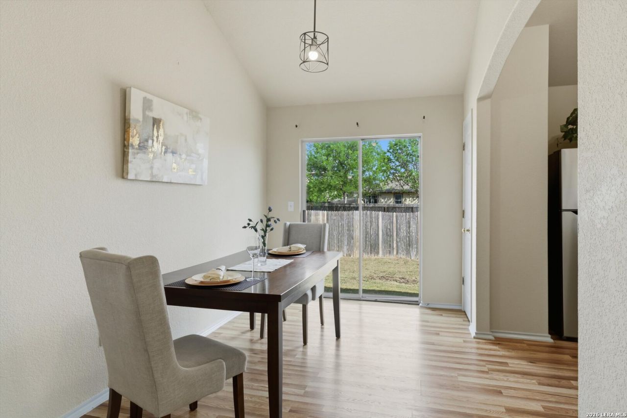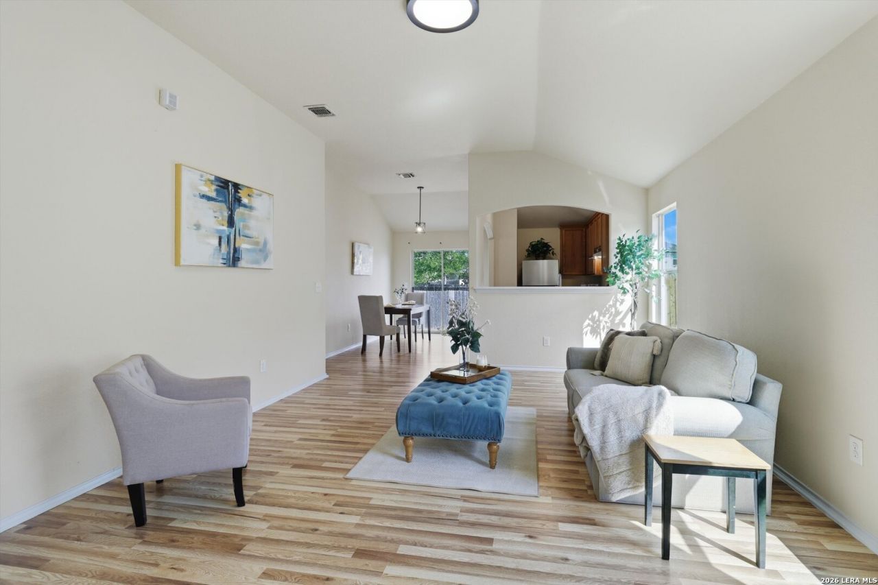 Welcome to this beautifully updated 3-bedroom, 2-bath home nestled in the quiet neighborhood of Meadows of Copperfield. Offering 1,327 square feet of thoughtfully designed living space, this home features abundant natural light, vaulted ceilings, and brand-new laminate flooring throughout, creating a bright, airy feel and enhancing the sense of spaciousness. Major updates include a new roof (2022) and a new A/C system (2023), providing peace of mind for years to come. Step inside to a welcoming open-concept living area that flows seamlessly into the updated kitchen and separate dining area. The kitchen features tall cabinets, ample counter space with new quartz countertops, and a brand-new sink, faucet, and disposal, along with a new dishwasher, stove, vent hood, and mircrowave-perfect for both everyday living and entertaining. The private primary suite offers a relaxing retreat, featuring an ensuite bathroom with an oversized soaking tub and a spacious closet. Two additional bedrooms, a full guest bath, and a dedicated laundry room complete the interior layout. Both bathrooms have been updated with new faucets, quartz countertops and new toilets. Enjoy outdoor living in the spacious backyard with a privacy fence-ideal for gatherings or quiet evenings at home. A two-car garage adds convenience and extra storage. Conveniently located near Loop 1604 and I-35, and just minutes from Randolph AFB, this move-in-ready home perfectly blends comfort, style, and accessibility. Dont miss your opportunity to make it yours!