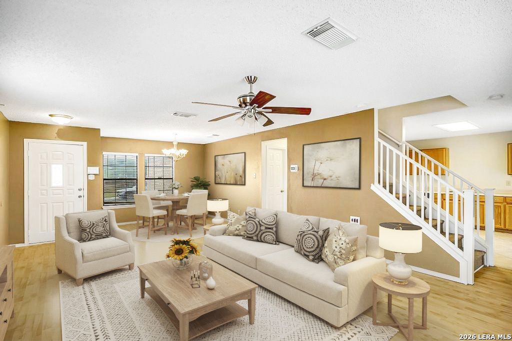 You owe it to yourself to visit this home, attractively situated on a large corner lot and offering a practical layout designed for everyday living. Incentives from a preferred lender may make buying even easier! The exterior features classic brick construction, several recently replaced windows, and a neutral paint palette ready for your personal touches. The downstairs living areas feature easy-care flooring with no carpet. The spacious kitchen offers ample cabinetry for storage and includes a newer dishwasher and microwave. A sliding door fills the space with natural light and opens to an oversized covered patio, creating a seamless connection to the backyard. The downstairs laundry room includes additional storage for added convenience. All bedrooms are located upstairs, providing added privacy and peace of mind for a restful nights sleep. Each bedroom is equipped with a ceiling fan, and the bathrooms include medicine cabinets. With the exception of wet areas, the upstairs features durable looped Berber carpet designed for long-term use. The primary bathroom includes dual vanities, making busy mornings more efficient. Outside, the large yard features new fencing and a mature shade tree. With its functional floor plan, low-maintenance features, and generous outdoor space, this home is a solid option for buyers seeking comfort, convenience, and long-term value. (Grass color has been enhanced.)